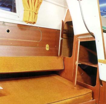 Kojen hochgeklappt. Unter der Niedergangsstufe ist der Abfallbeutel