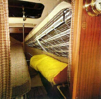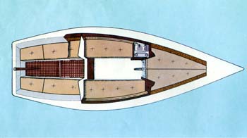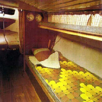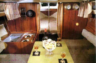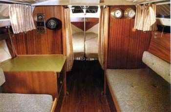 Am Einrichtungsplan erkennt man das großzügigen Raumangebot mit den beiden Längskojen in der Hauptkajüte und den hochklappbaren Kojen im Vorschiff. Hier wurde eine optimale Raumausnutzung erreicht. Viele Holz und die breiten, bequemen Polster geben dem Schiff eine wohnliche Atmosphäre.
