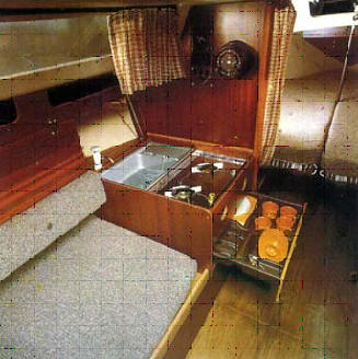 Innen ist die Yacht überraschend geräumig. Die Abdeckplatte von Pantry und Spüle ist gleichzeitig Kajüttisch. In der Hauptkajüte befinden sich zwei erstaunlich breite Schlafkojen. Ihre Länge von 1,95 m wird möglich, weil die Fußenden unter die Sitzduchten des Cockpit reichen - ein Beispiel für durchdachte Raumausnutzung.
