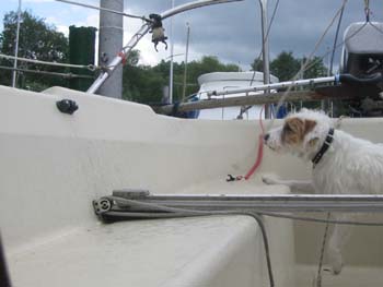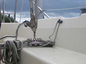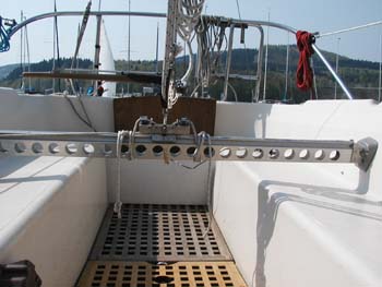 Die Installation war beim Kauf schon vorhanden. Typenschilder sind keine vorhanden, kann also dazu keine Angaben machen. Die Travellerschiene wird in den Lagerblöcken links und rechts einfach nur mit einem Metallstift gesichert, damit sie nicht nach unten herausfällt. Das ist sehr praktisch, wenn man mal Platz im Cockpit braucht. Die Demontage dauert keine Minute: Stifte raus, Großshot umschäkeln, Traveller irgendwo lagern. Die Halterungen links und rechts haben keine scharfen Kanten, man bleibt nicht so schnell hängen und reißt sich nicht die Bekleidung kaputt. Der Vorteil des Travellers ist enorm, insbesondere wenn es so richtig kachelt. Man stellt für den Kurs das Großsegel mit der Großschot ein und wenn eine Böe durchkommt, fiert man einfach den Traveller nach Lee, ohne Benutzung der Großschot. Dadurch hat das Segel immer einen optimalen Stand und flattert nicht so wild durch die Gegend, wie das der Fall ist, wenn man die Großschot fiert. Für Regattasegler ist es fast ein Muß, für Fahrtensegler eine Erleichterung. Man braucht generell nicht so schnell zu reffen, weil man mit dem Traveller den Druck aus dem Segel nimmt und wesentlich aufrechter fahren kann und das Großsegel behält trotzdem seinen guten Stand. Ich kann die Nachrüstung nur empfehlen. Habe beim googeln dies gefunden, ist aber keine entsprechende Halterung für die seitliche Montage dabei: Hier die Lösung von Michael Standring: